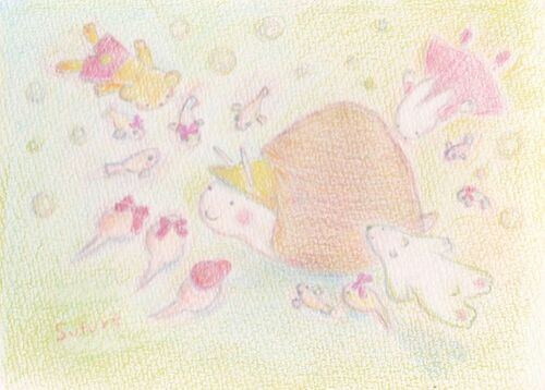 タニシさんが おさんぽ してる。 のんびり のんびり おさんぽ してる。 風さんが ふいても 雨さんが ふっても 雪さんが ふっても かみなりさまが うたっても いい おてんき だなぁ って ニコニコ ニッコリ。 とっても うれしそうです。 きっと いろーんな お…